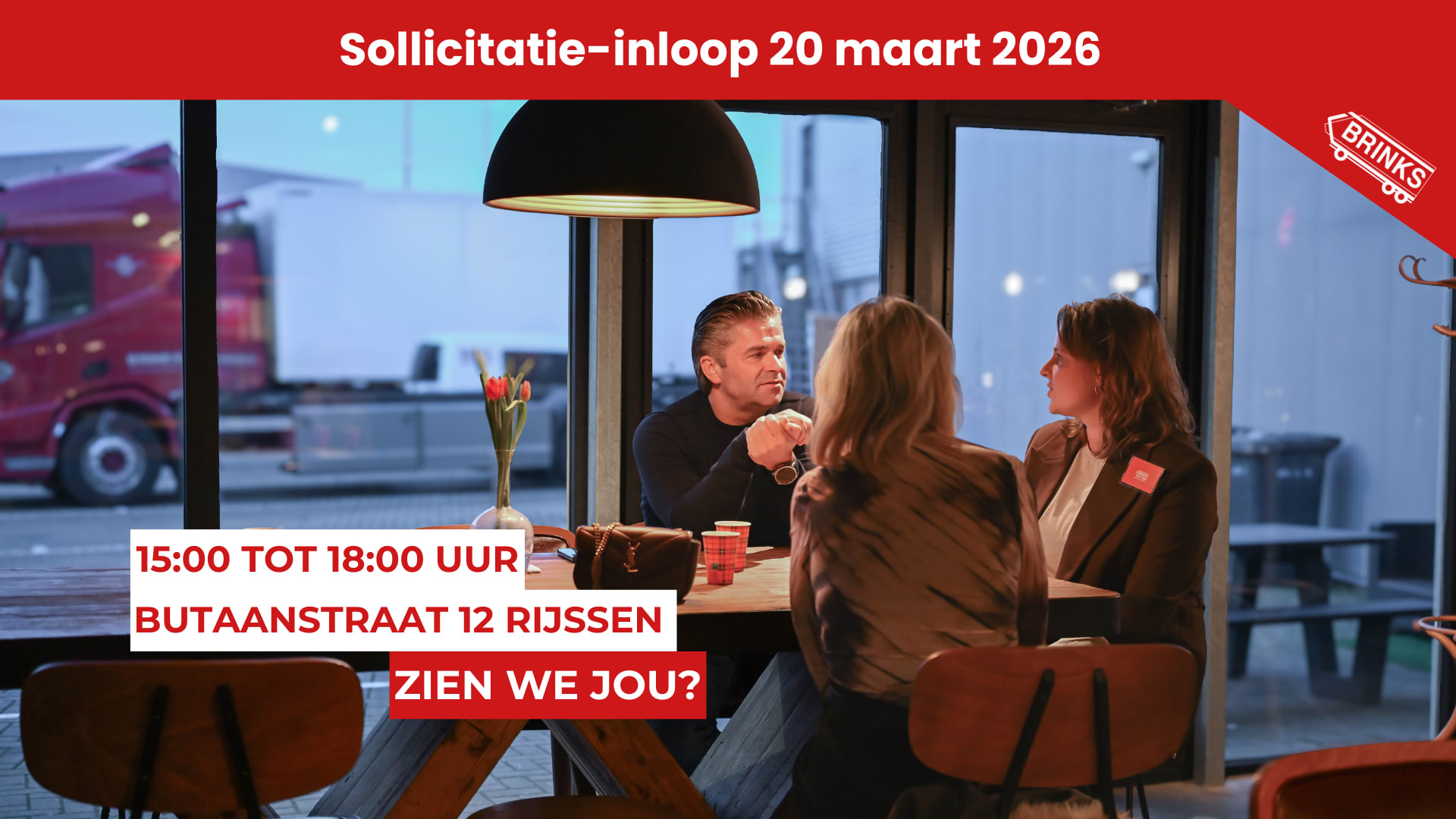 Op vrijdag 20 maart (15.00–18.00 uur) organiseren wij een sollicitatie-inloop. Kom langs om kennis te maken en direct te solliciteren. Aanmelden is niet verplicht, mocht je dit toch willen doen graag via personeelszaken@brinkstransport.nl